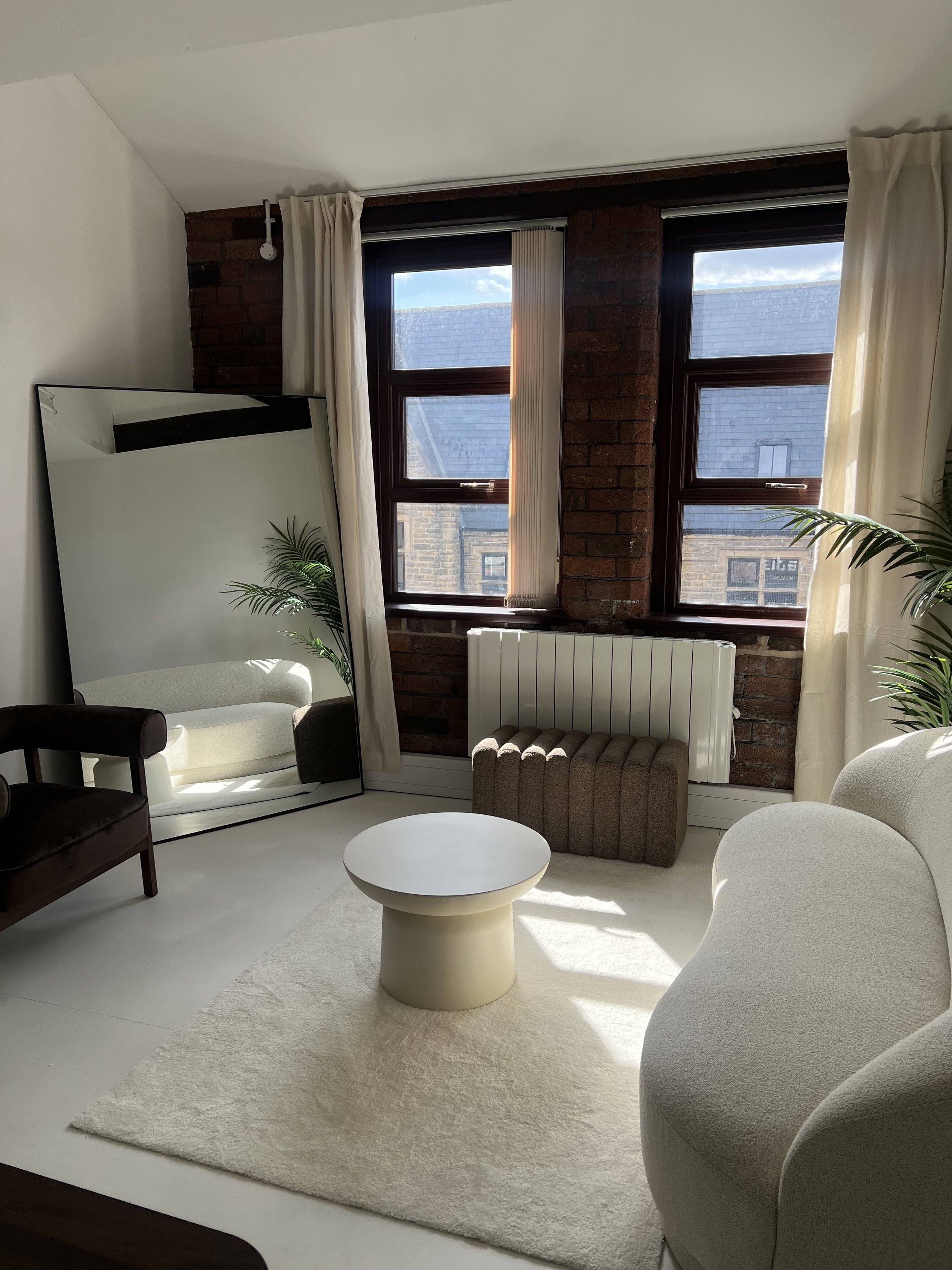 A living room corner with a large tilted mirror, a beige upholstered chair, a dark armchair, a white round coffee table, and a cream-colored sofa. There are tall windows with brick walls, white curtains, and plants.