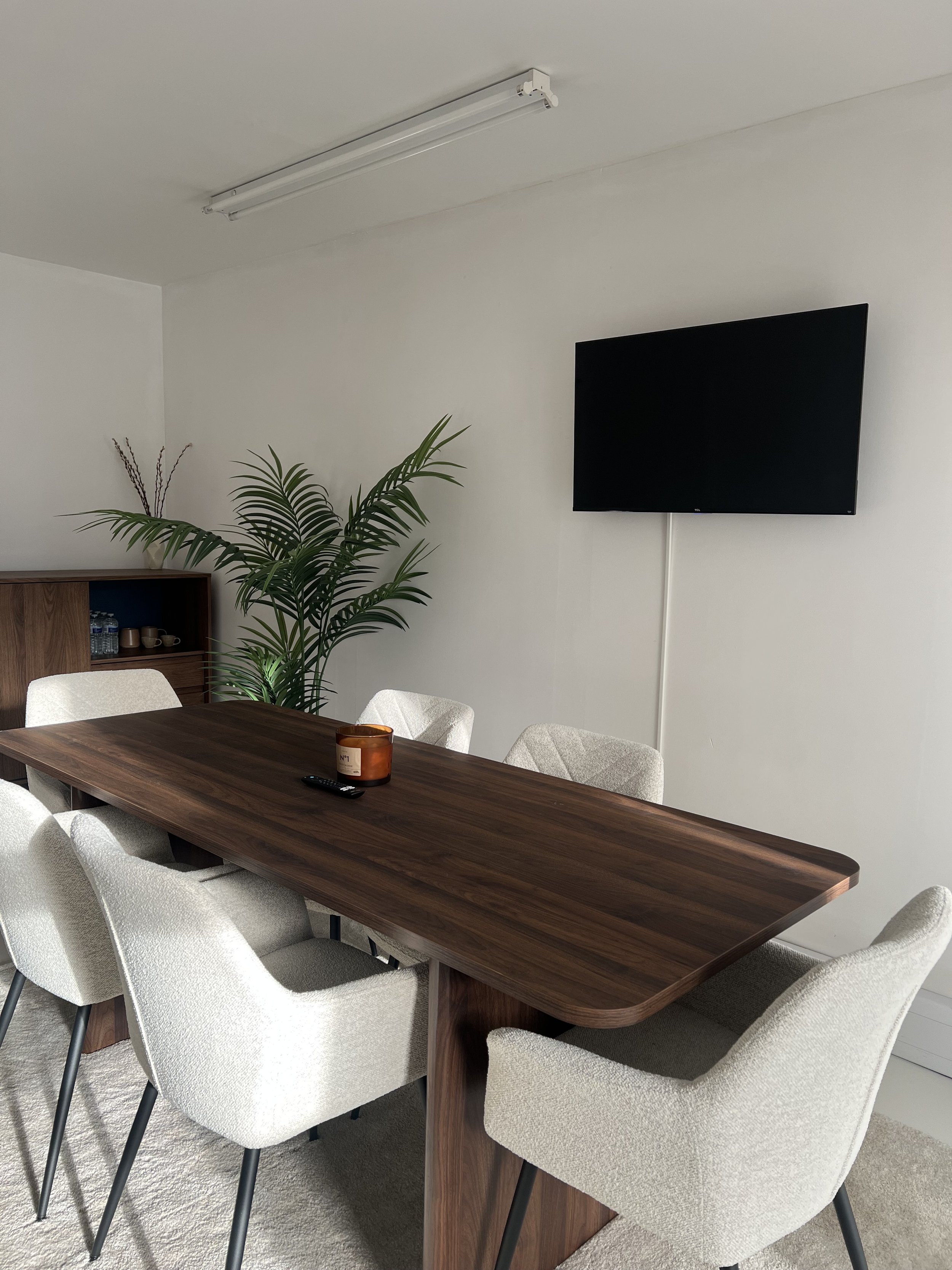 Modern meeting room with a wooden table, six beige upholstered chairs, a large flat-screen TV on the wall, a potted plant, and a small cabinet with water bottles and cups.