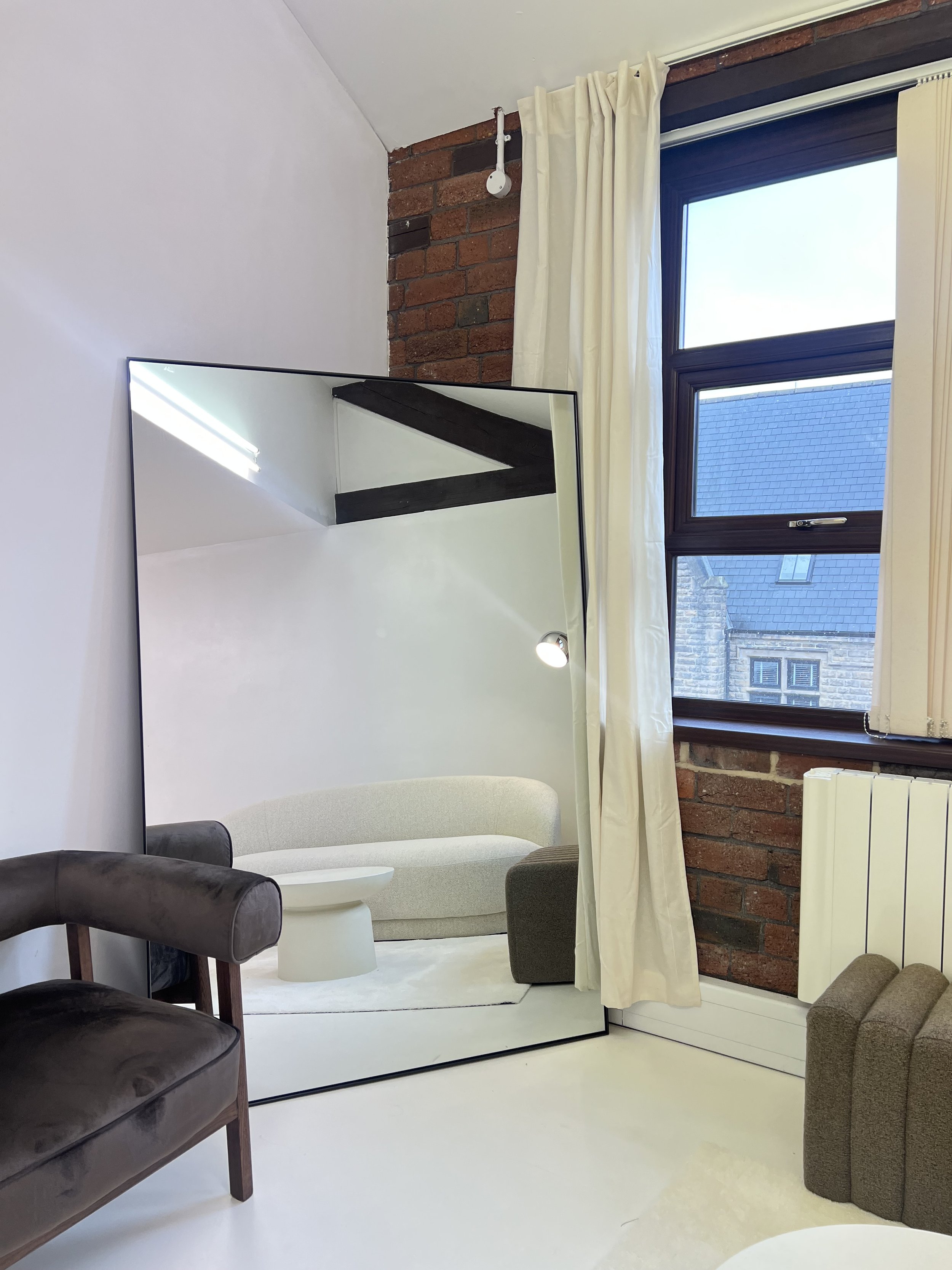 Interior room with a large standing mirror reflecting a white couch and a black round coffee table, nearby a window with cream curtains, exposed brick wall, and ceiling with support beams.