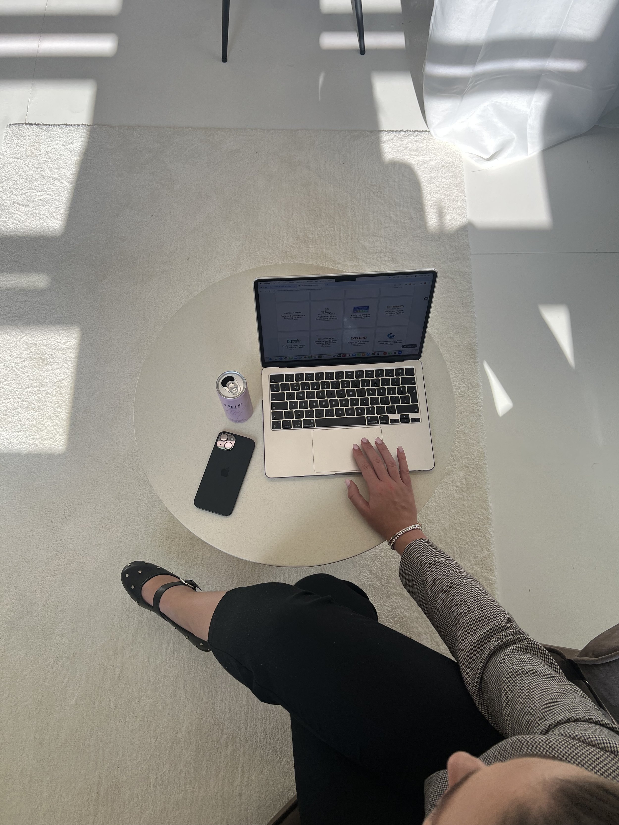 A person standing next to a small round table with a laptop, a smartphone, a can of soda, and a blanket, outdoors in sunlight.