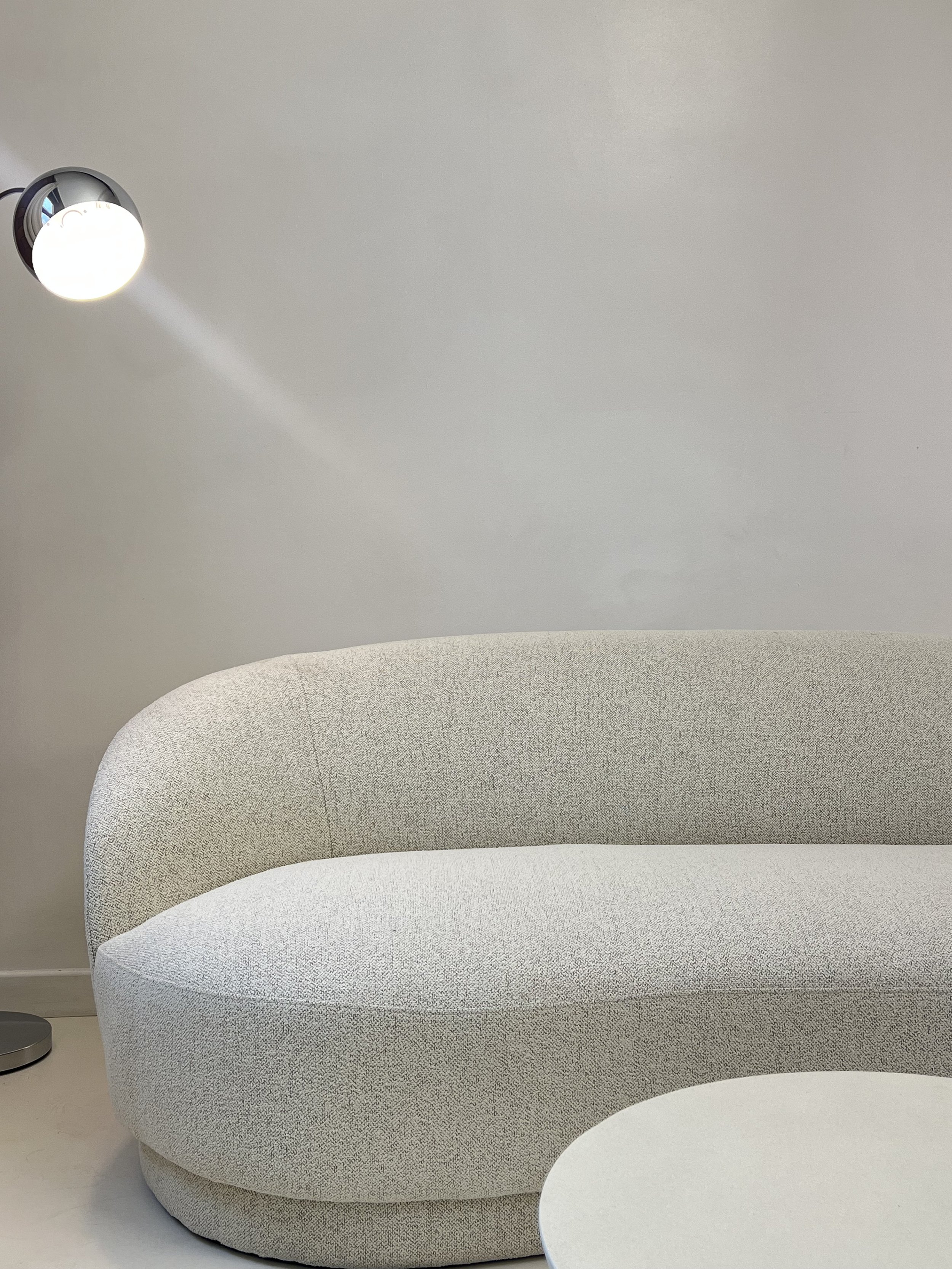 A beige upholstered sofa with a rounded shape in front of a plain light gray wall, with a modern floor lamp on the left side of the image.