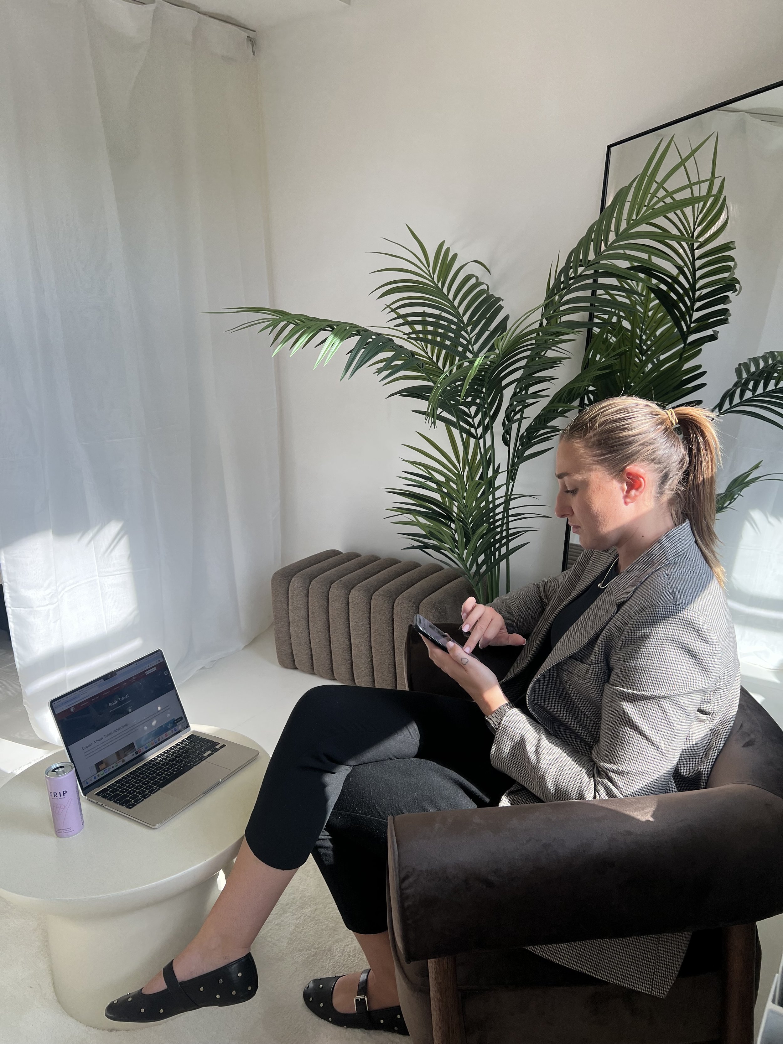 A woman sitting on a brown office chair, looking at her phone, with a laptop and a can on a small white table in front of her. Behind her is a large green plant and a mirror.