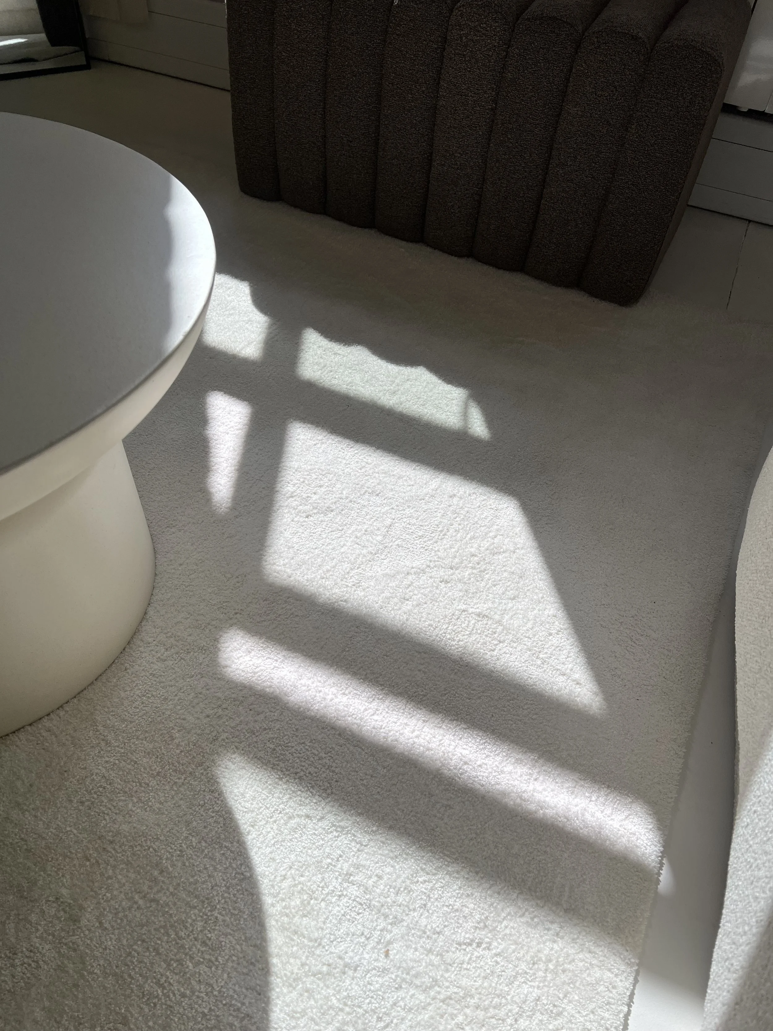Sunlight casting shadows of a window frame onto a white carpeted floor next to a beige round table and brown upholstered furniture.