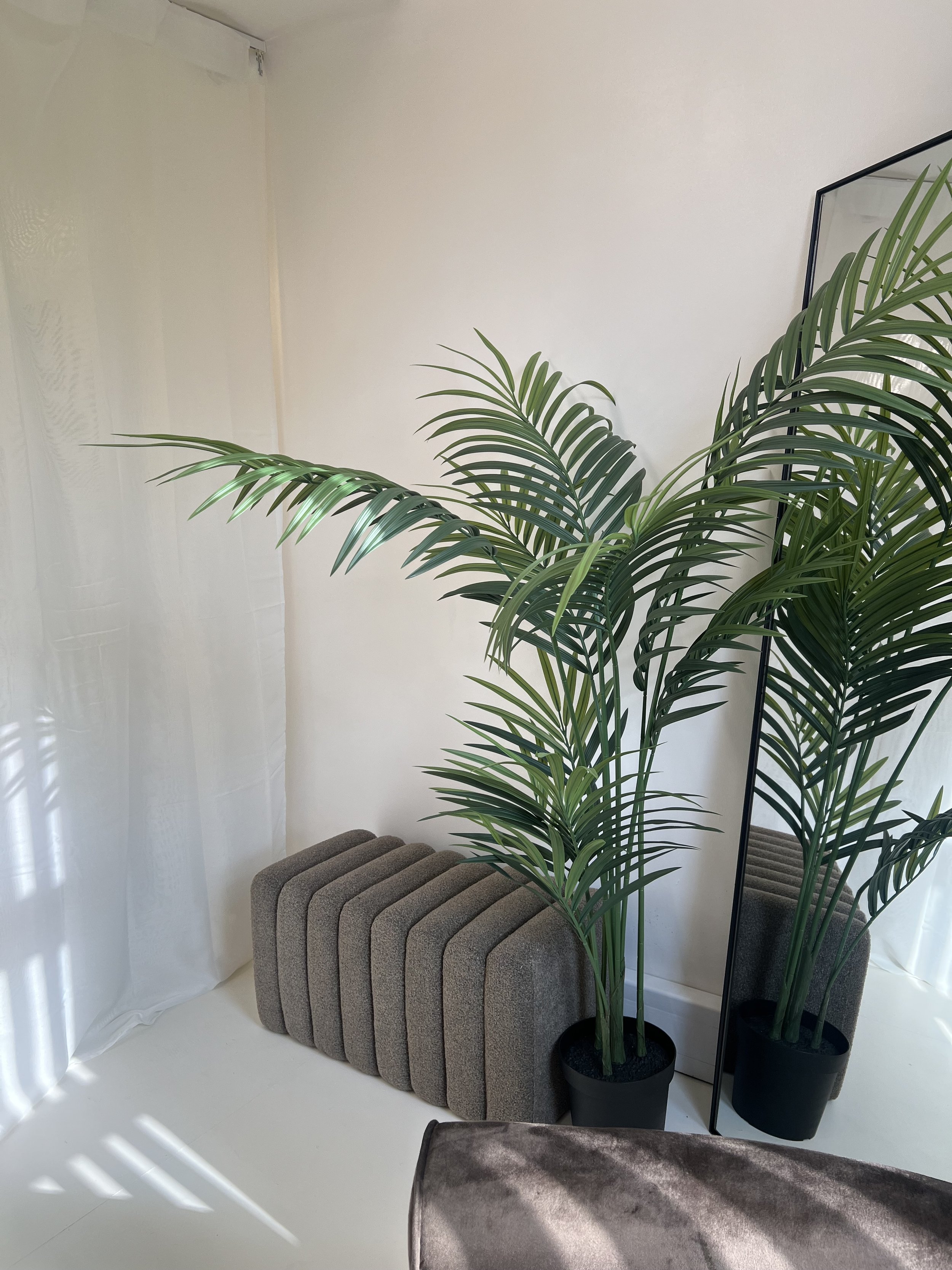 A tall potted green palm plant next to a mirror in a room with white walls and floor, with sunlight casting shadows on the floor.