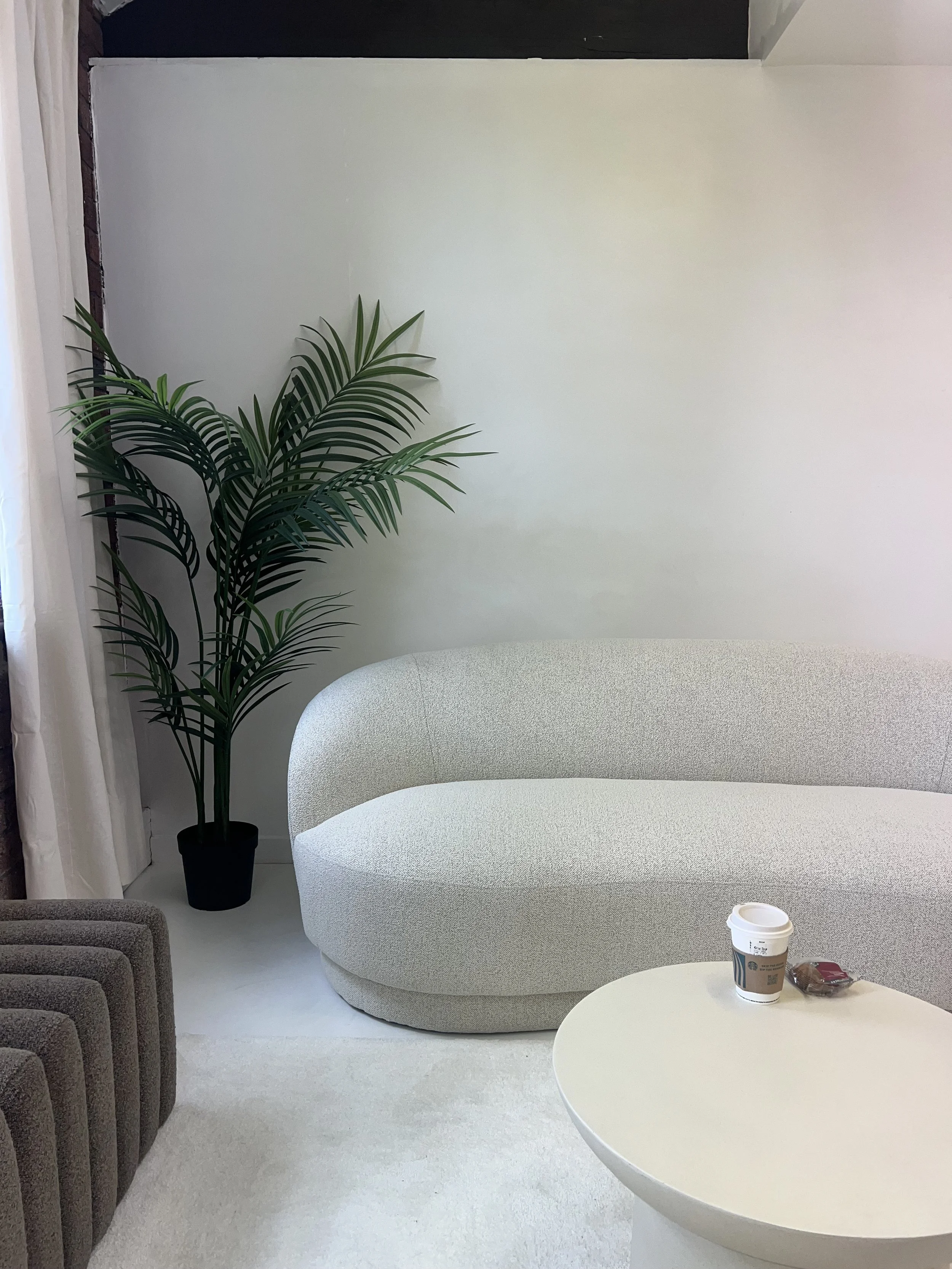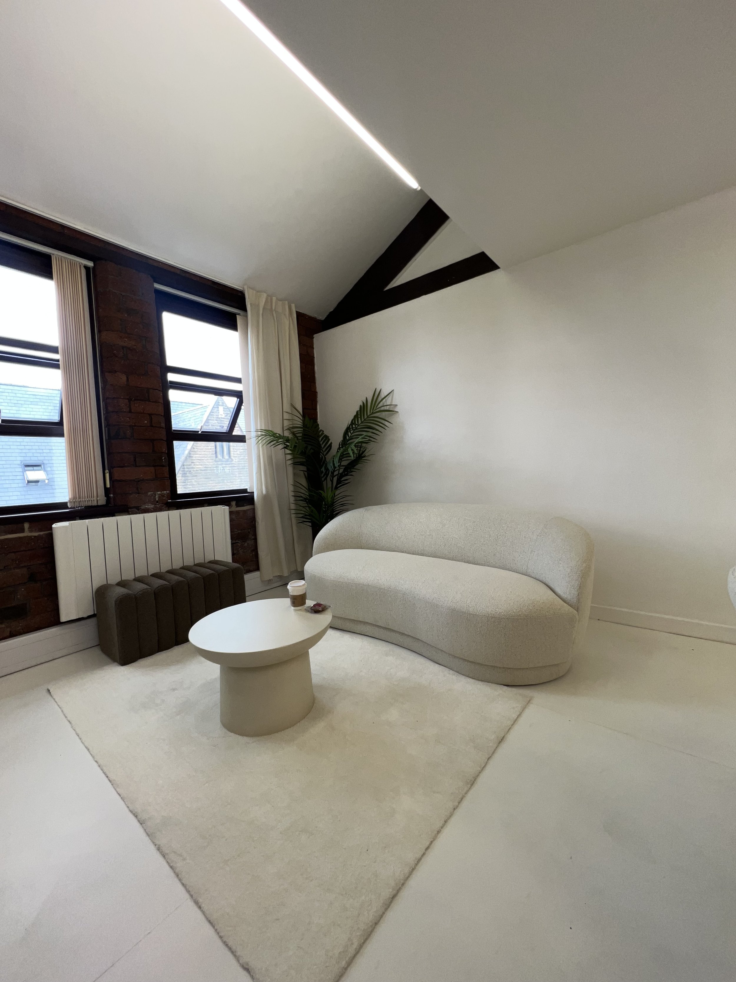 Modern minimalist living room with white curved sofa, round coffee table, potted plant, brick wall with windows, and cream-colored rug.