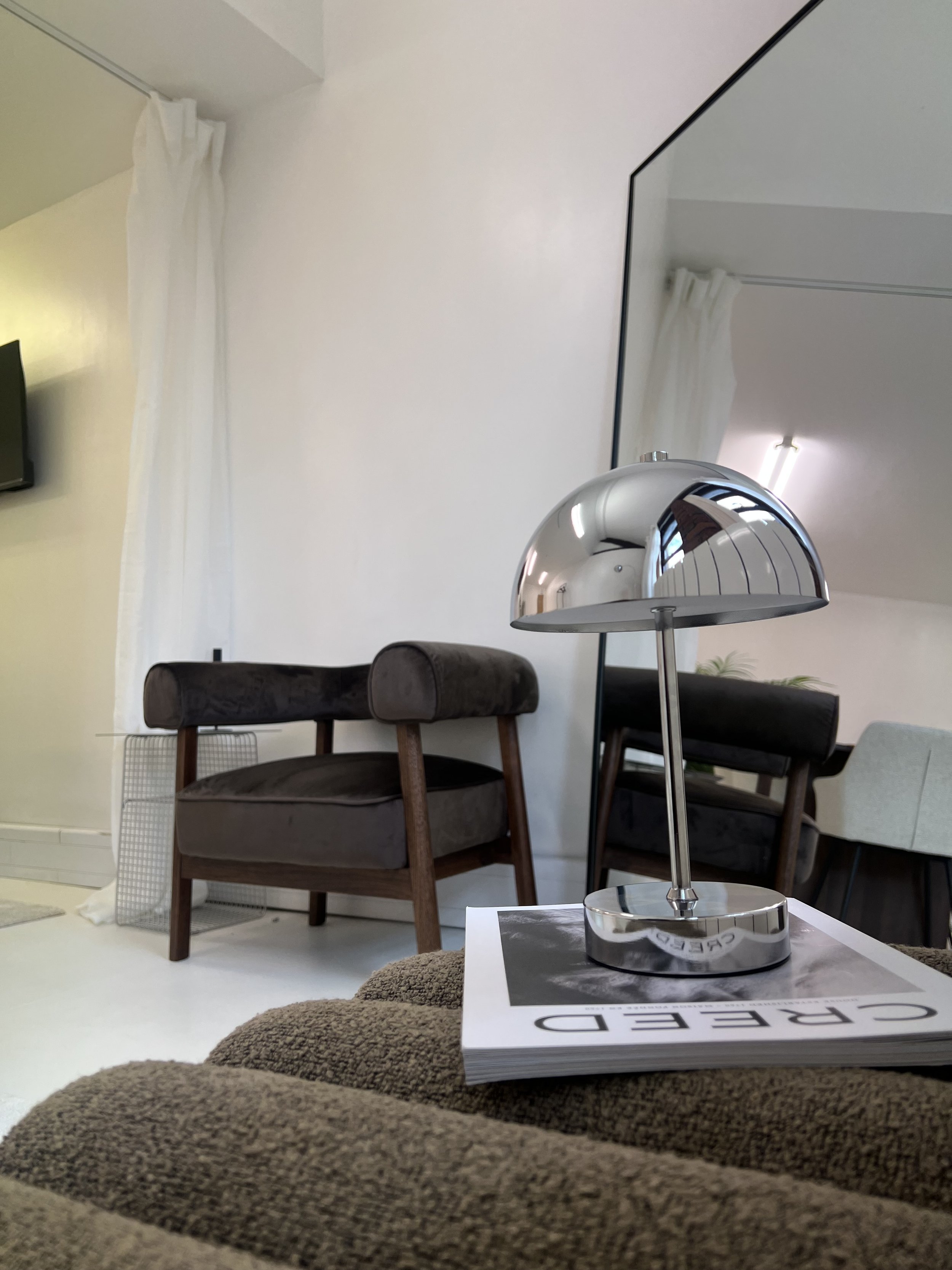 Modern living room with a chrome desk lamp, a couch, and wooden chairs. There's a mirror on the wall and a television in the background.