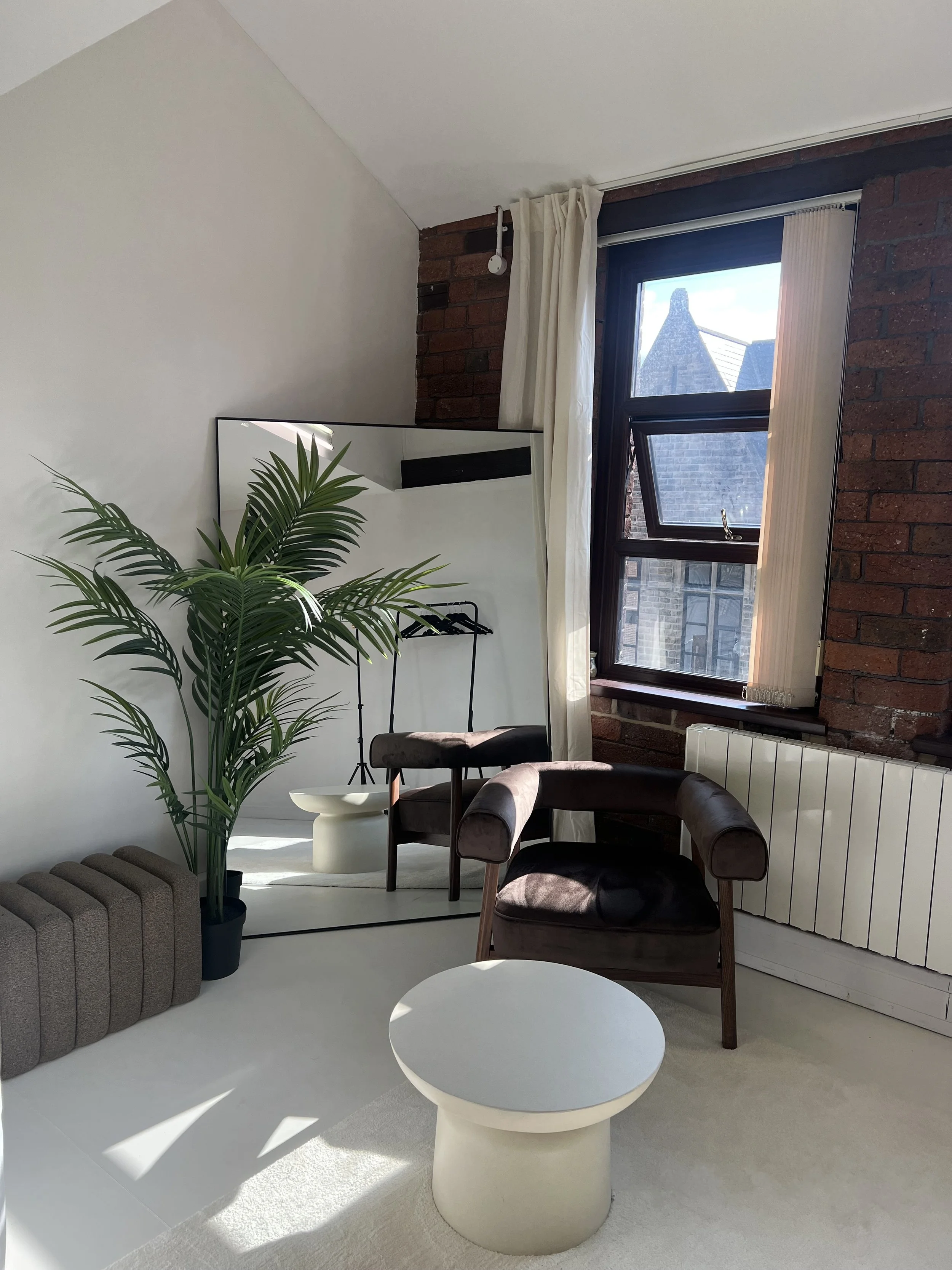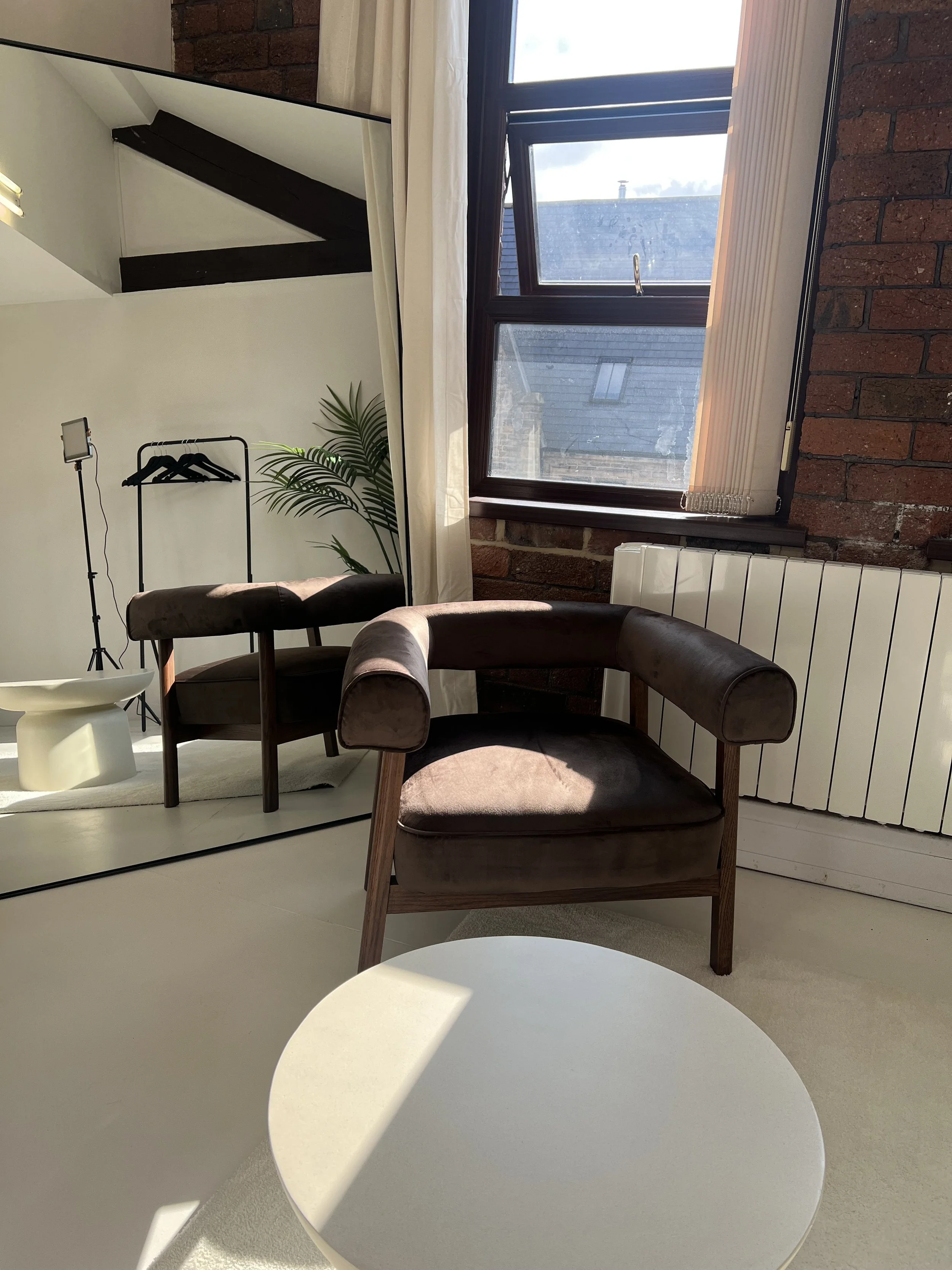 A modern interior room with a brown armchair, a white side table, a tall potted plant, black clothing rack, studio light, white rug, and large window with curtain and exposed brick wall.