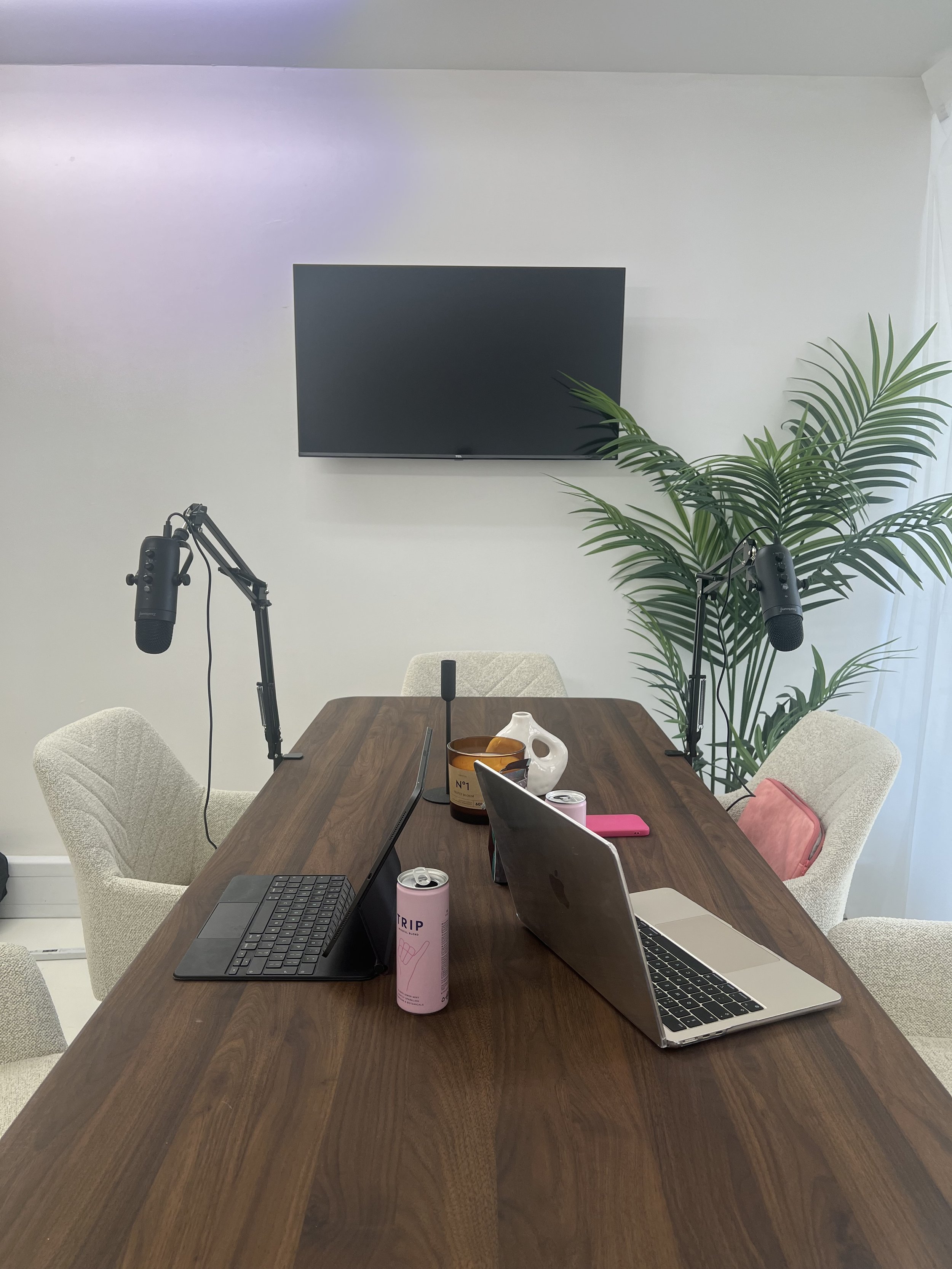 Meeting room with a large wooden table, two laptops, microphones, laptops, hint drink cans, a small pink notebook, a decorative vase, and a large plant against a white wall, with a TV screen mounted on the wall.