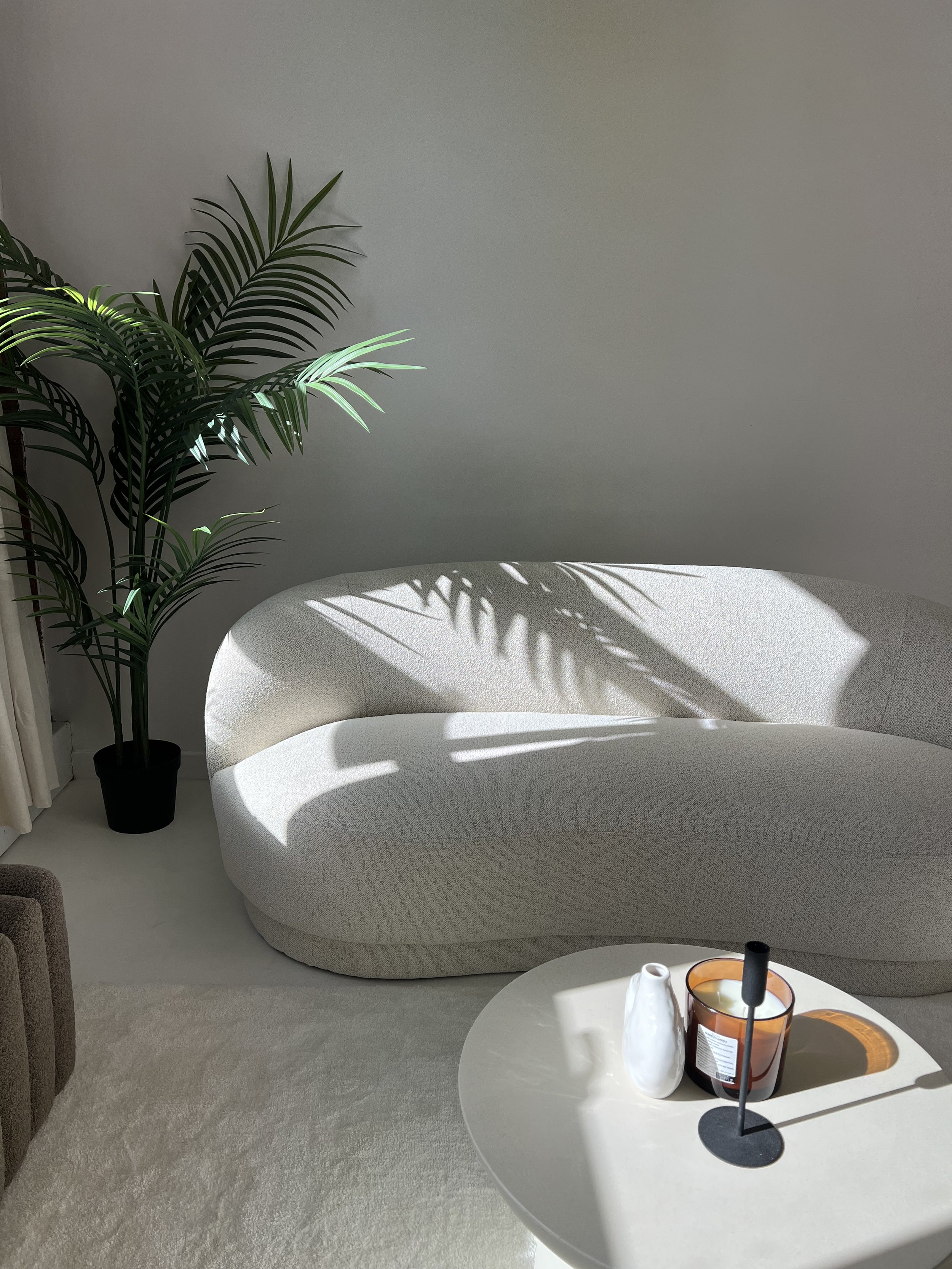 A modern living room corner with a large green plant, a beige curved sofa, and a white round coffee table with a candle, a white vase, and a black candlestick, with sunlight casting shadows of the plant leaves on the sofa and wall.