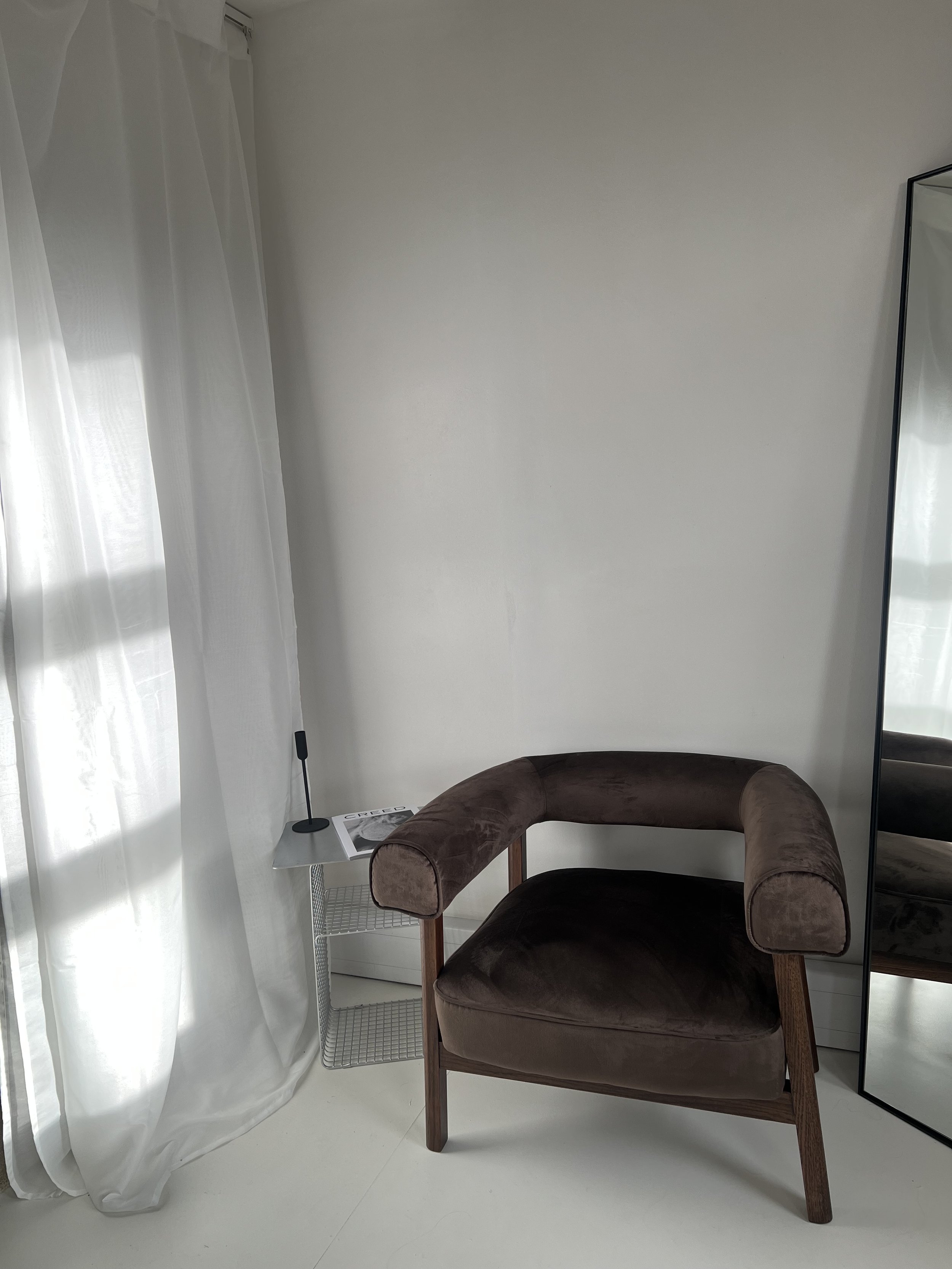 A brown velvet armchair with wooden legs in a corner, next to a small side table with a magazine and a lamp, near a window with sheer white curtains.