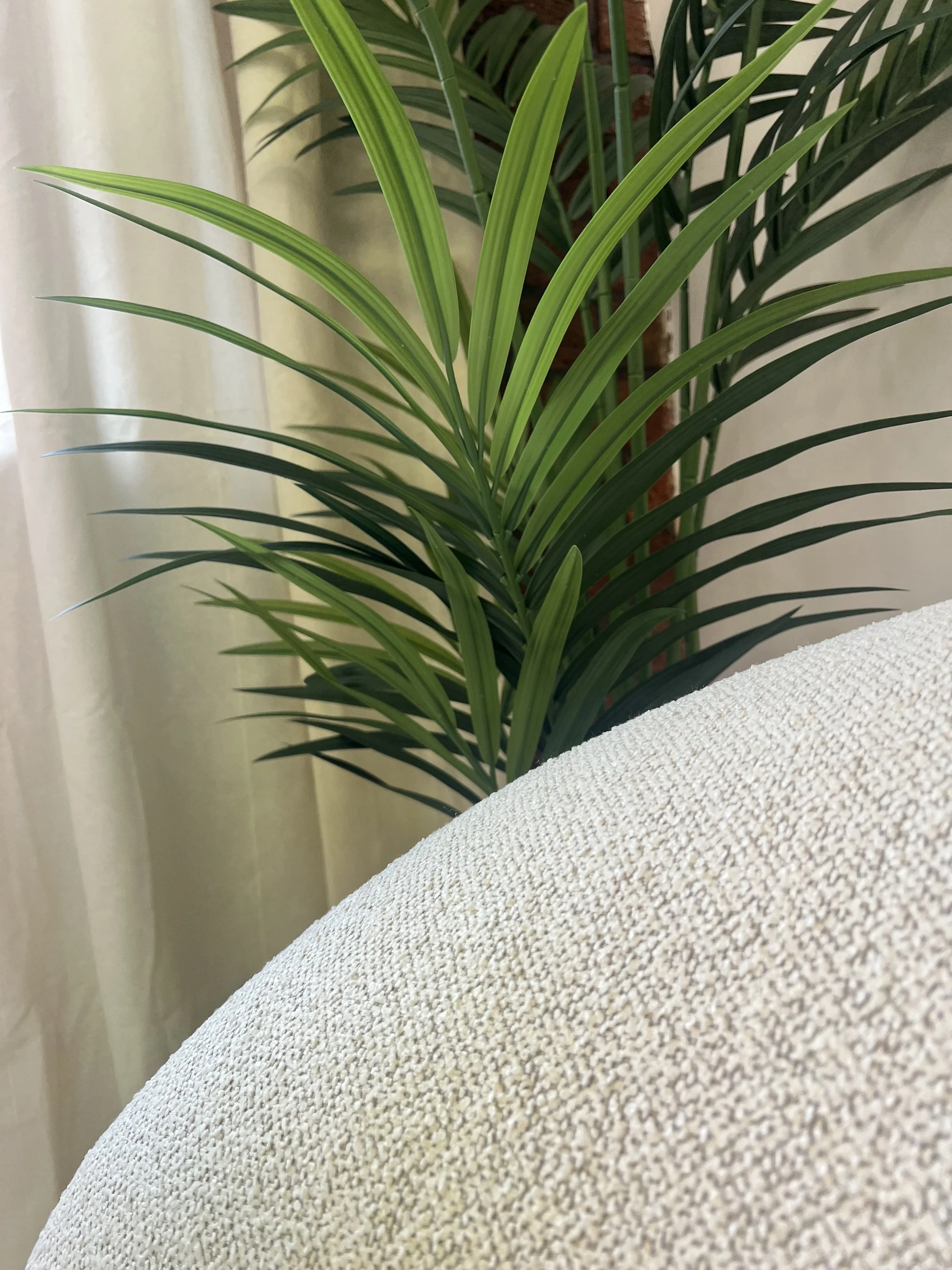 Close-up of a green potted plant with long, narrow leaves in a room with cream-colored curtains and on a beige textured surface.