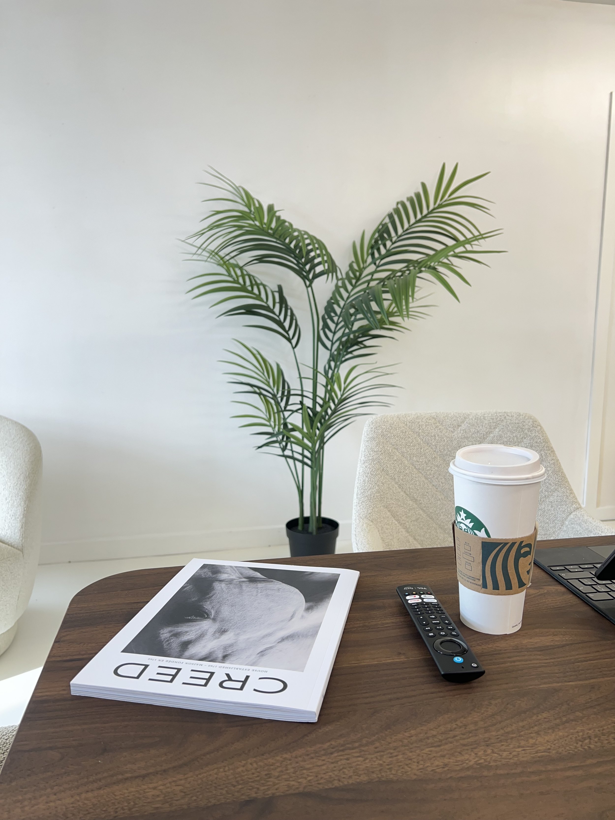 Indoor office scene with a wooden table holding a Starbucks coffee cup, a remote control, a black keyboard, and a stack of magazines, with a large green potted plant and white chairs in the background.
