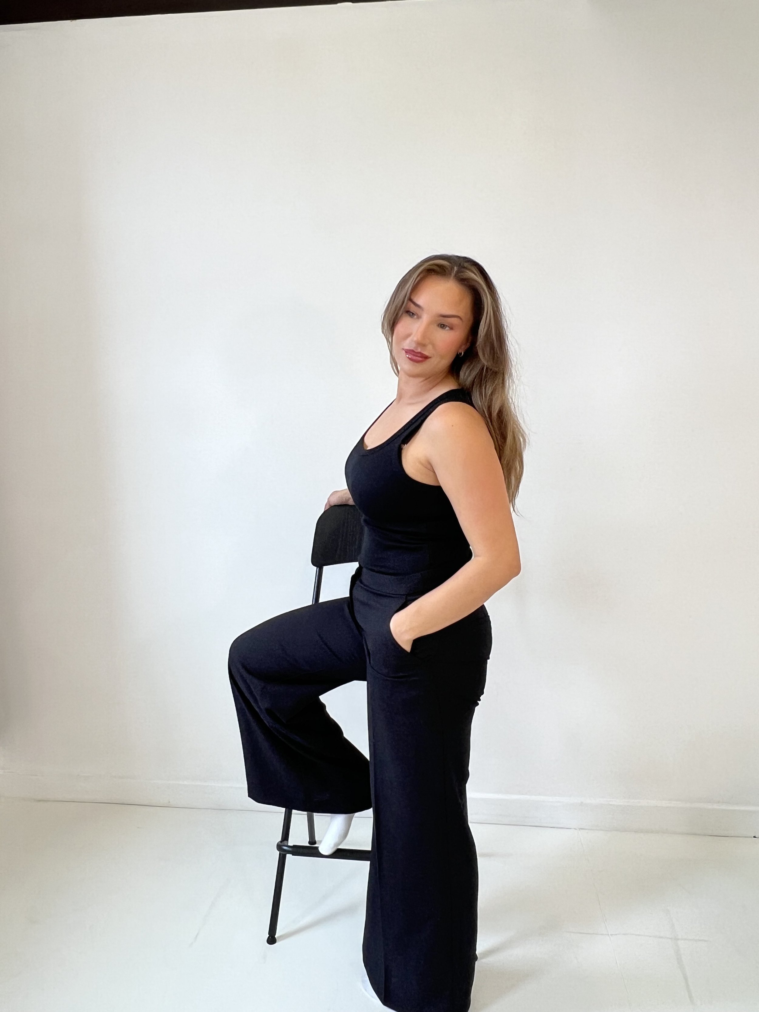 A woman with long brown hair in a black sleeveless top and black pants, standing with one foot on a chair, against a plain white wall.