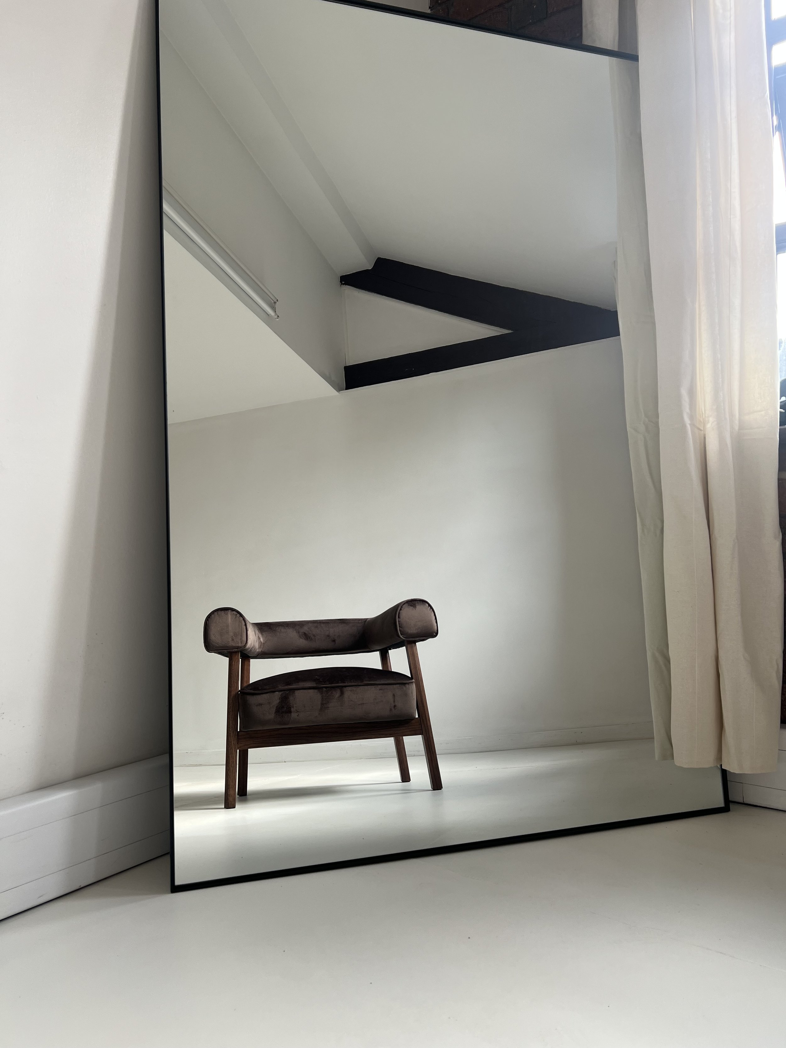 A large mirror leaning against a wall, reflecting a small brown velvet armchair with wooden legs inside a room with white walls and ceiling, and some black ceiling beams.
