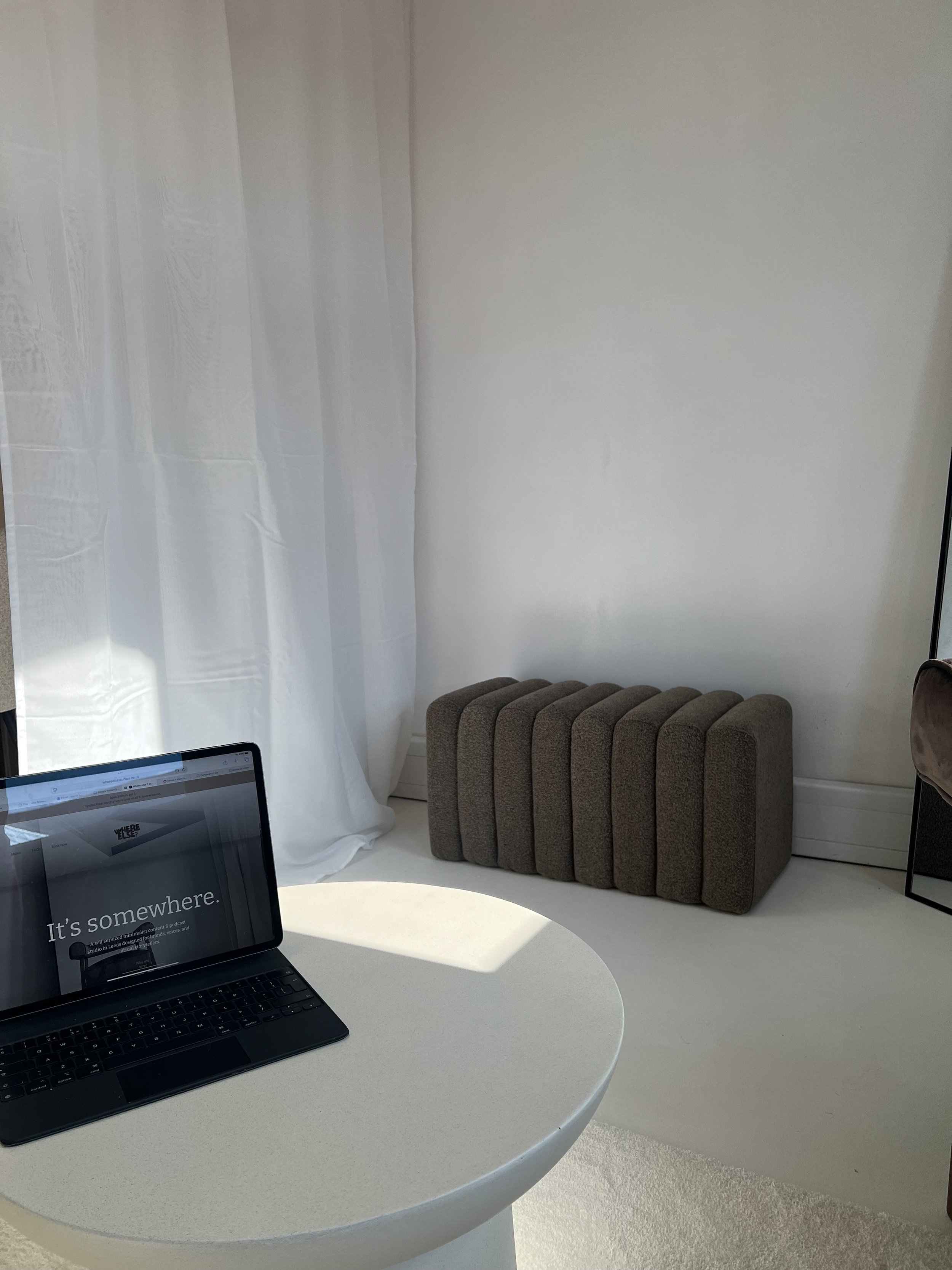 A round white table with a black laptop displaying the text 'It's somewhere.' in a minimalist room. The room has white walls, a sheer white curtain on the left, and a brown upholstered vent cover or heater on the floor against the wall.