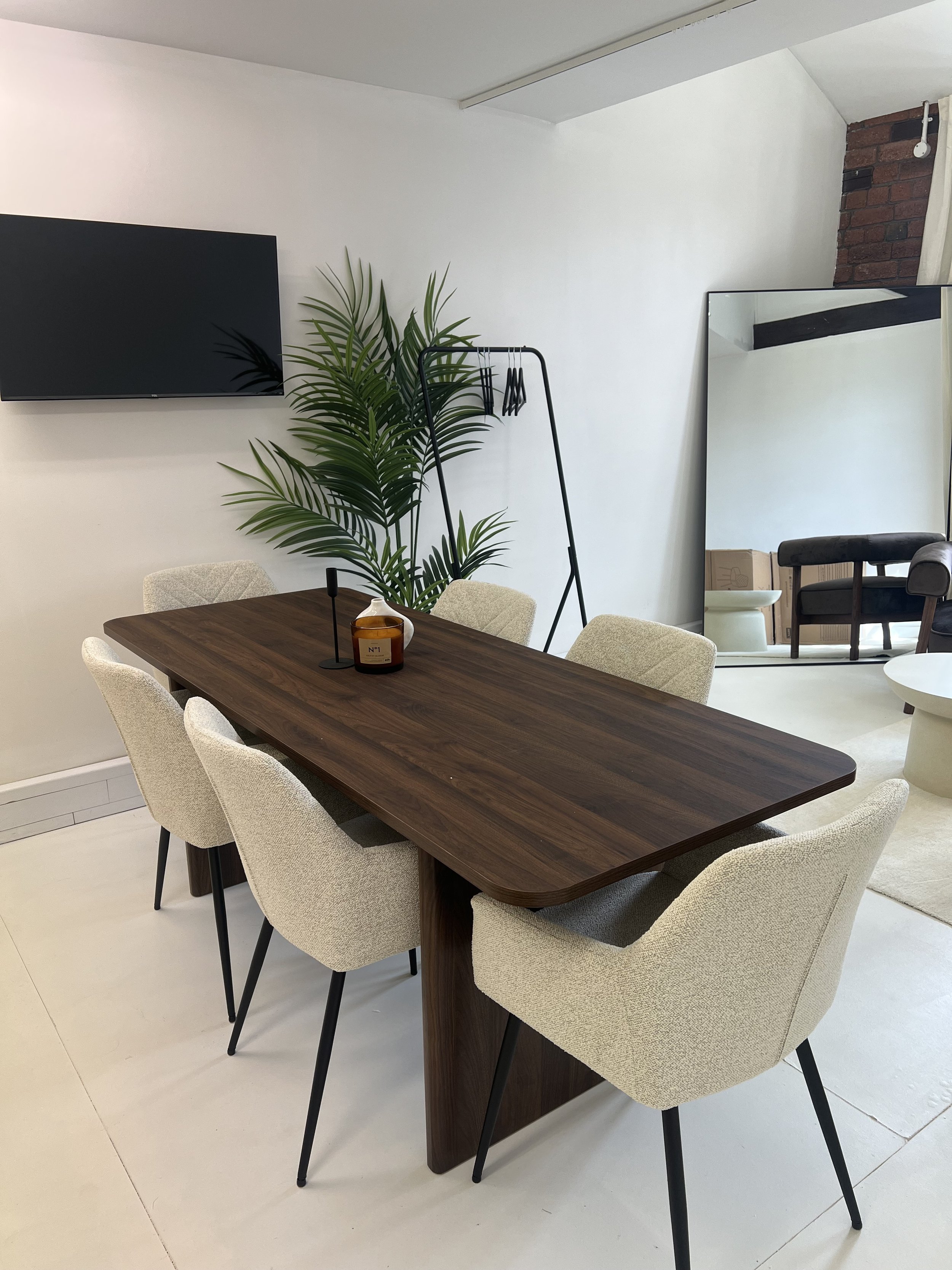 Contemporary dining room with a wooden table, six beige upholstered chairs, a large potted plant, wall-mounted TV, large mirror, and modern decor.