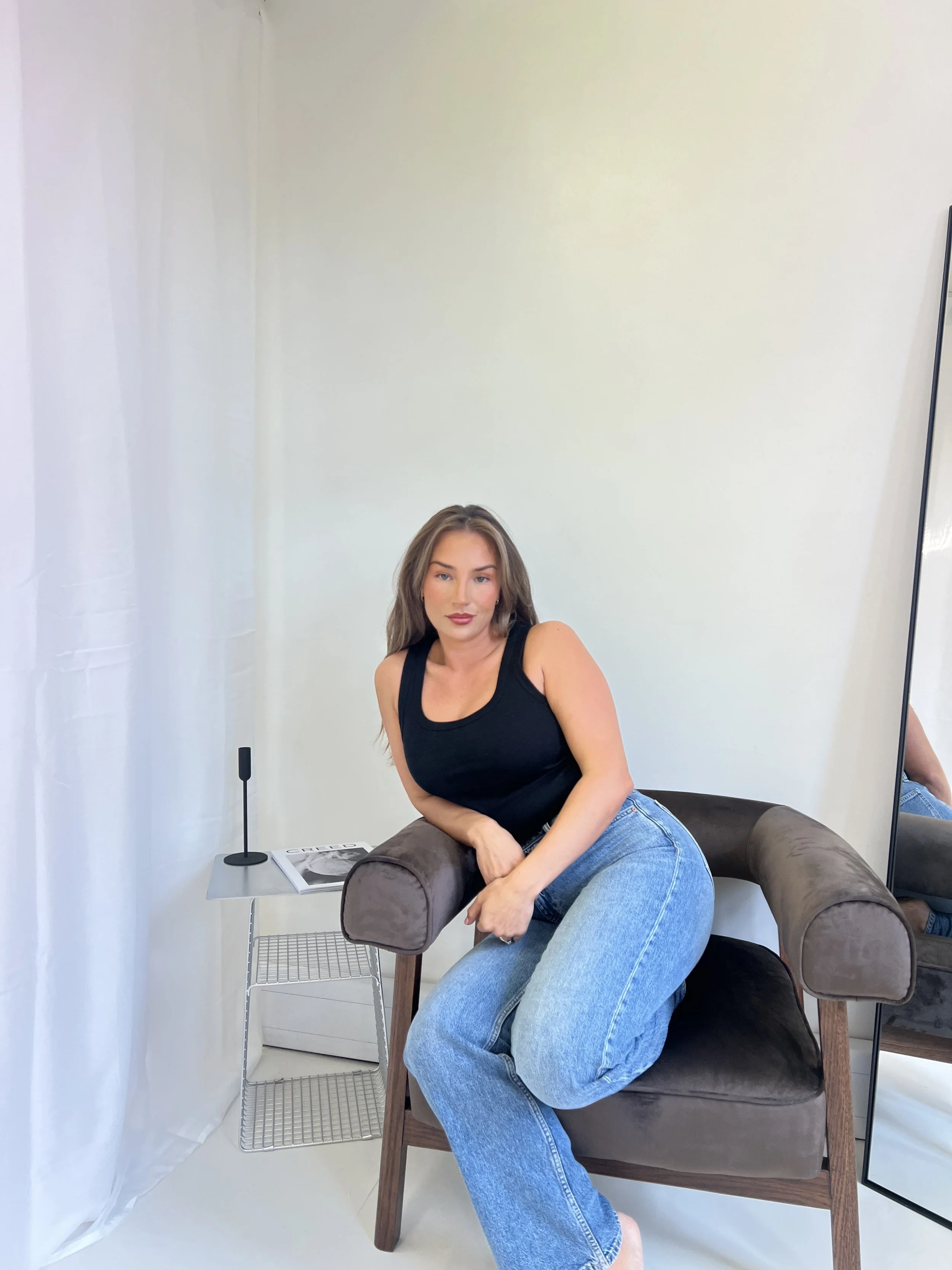 A woman with long brown hair wearing a black tank top and blue jeans sits on a brown armchair, leaning on its armrest, in a room with plain white walls. There is a small side table with a magazine and a microphone stand behind her, and a mirror on th