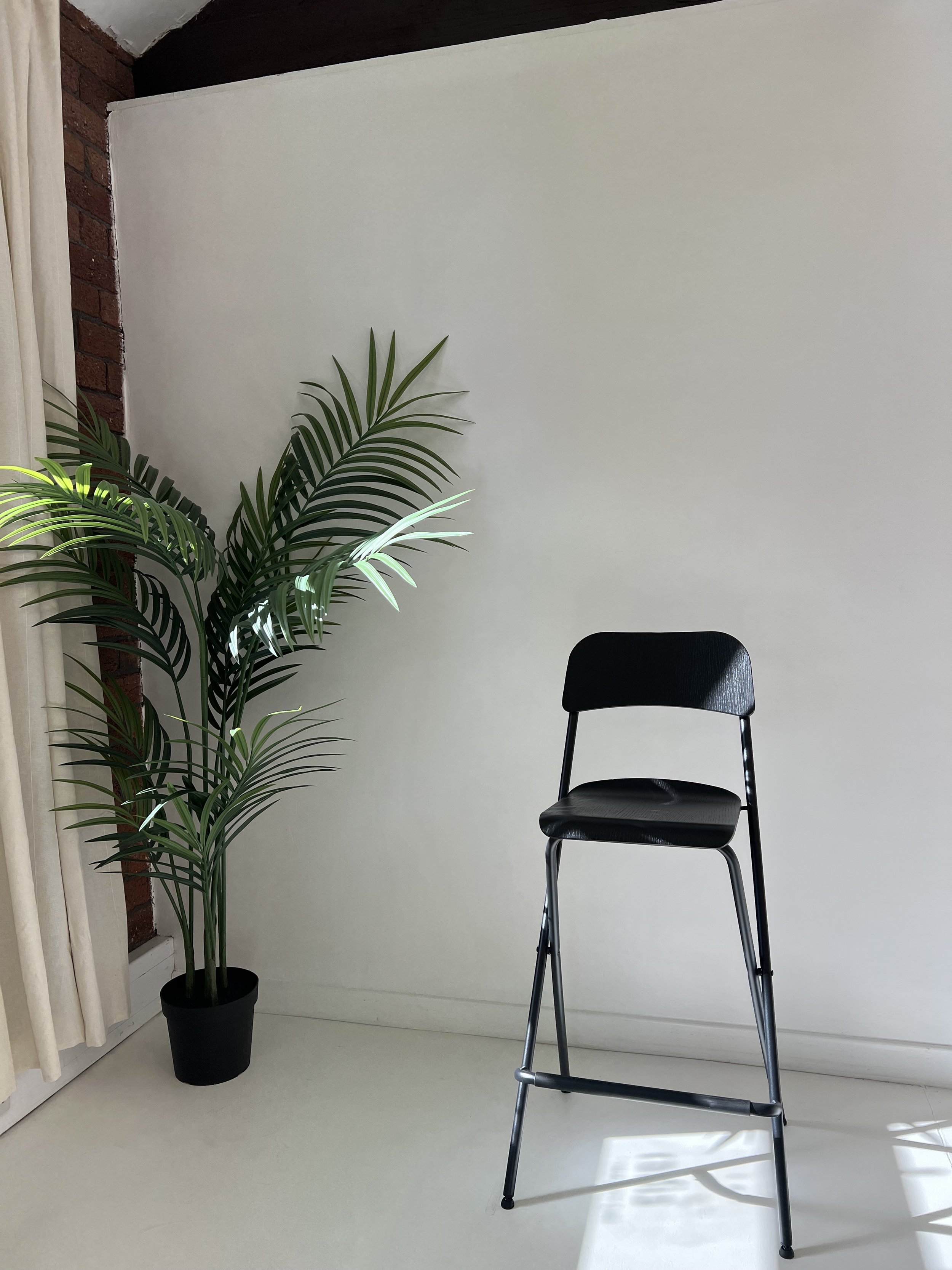 A black folding chair next to a potted green palm plant in a room with white walls and a brick wall corner.