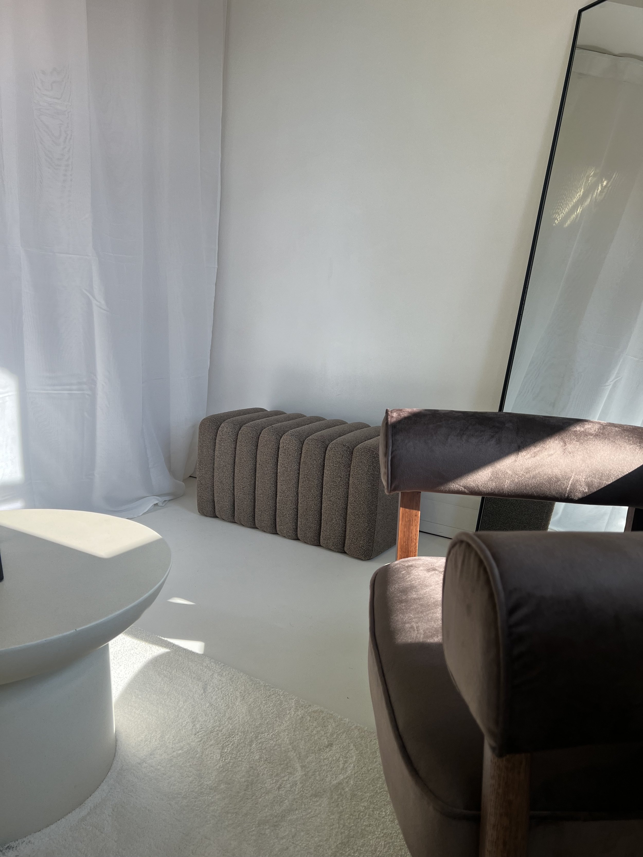 A minimalist interior with a white cylindrical table, a beige upholstered armchair, a brown armrest, a padded gray filter on the floor, a white curtain on the left, a white wall, and a large mirror on the right reflecting part of the room. Sunlight c