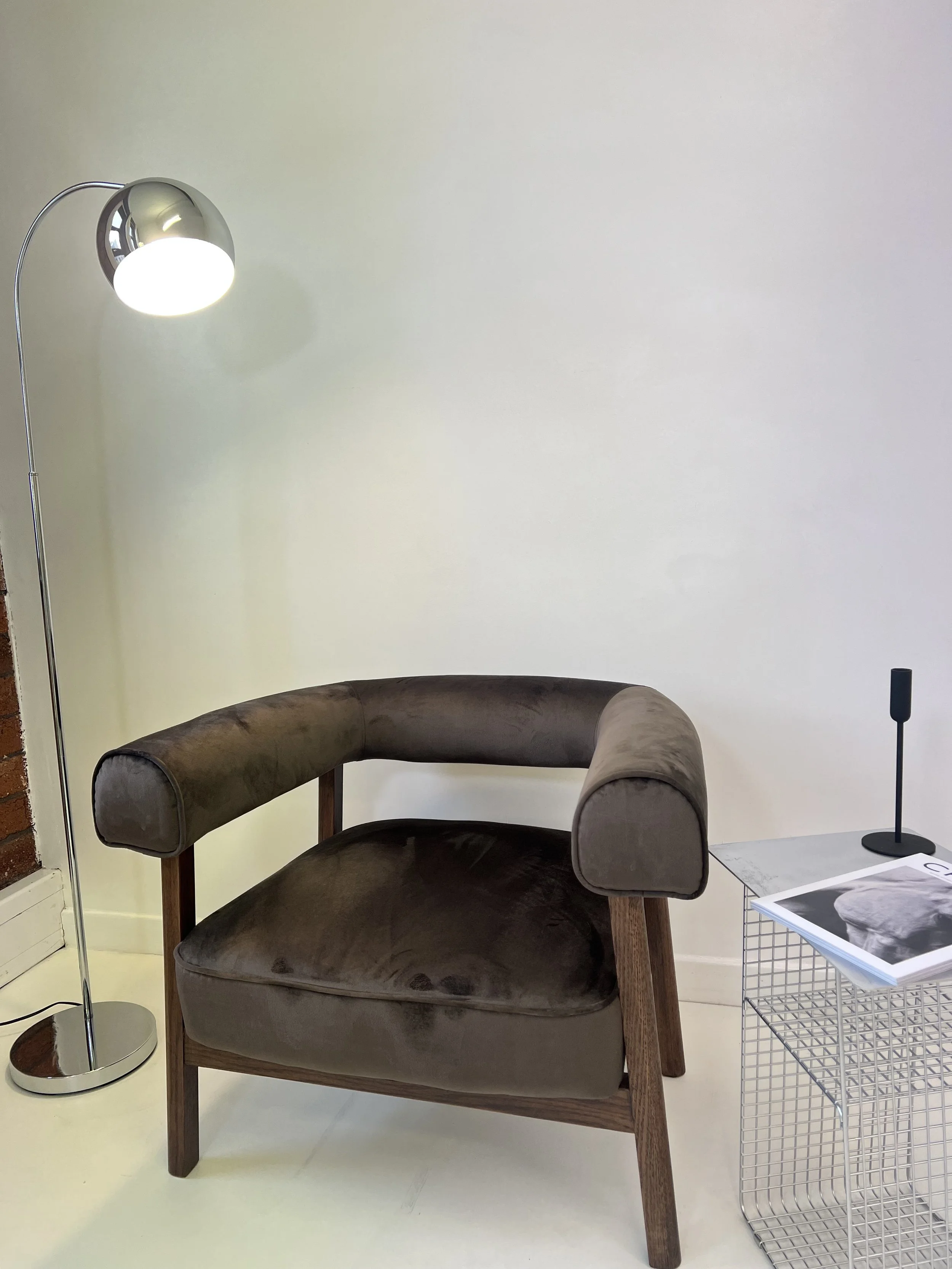 A brown velvet armchair with wooden legs next to a white wire side table with a magazine and a black microphone on top, and a chrome floor lamp with a rounded shade, all against a plain off-white wall.